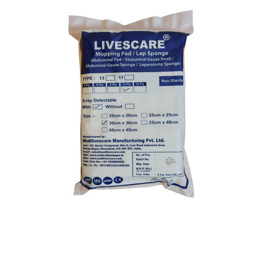 Gauze sponge is a disposable surgical dressing product commonly used in surgery and medical care. Get best quality Gauze Sponge and Abdominal Gauze Sponge from Medilivescare Manufacturing. We are a leading Gauze Sponge Manufacturers in India, Gauze Sponge Manufacturers, Gauze Sponge Exporters in India, Gauze Sponge suppliers in India. We offer OEM for Gauze Sponge, which is also called as Abdominal Gauze Sponge, Laparotomy Sponge, Lap Sponge, Mopping Pad etc. Our price is very economical and quality is superior.